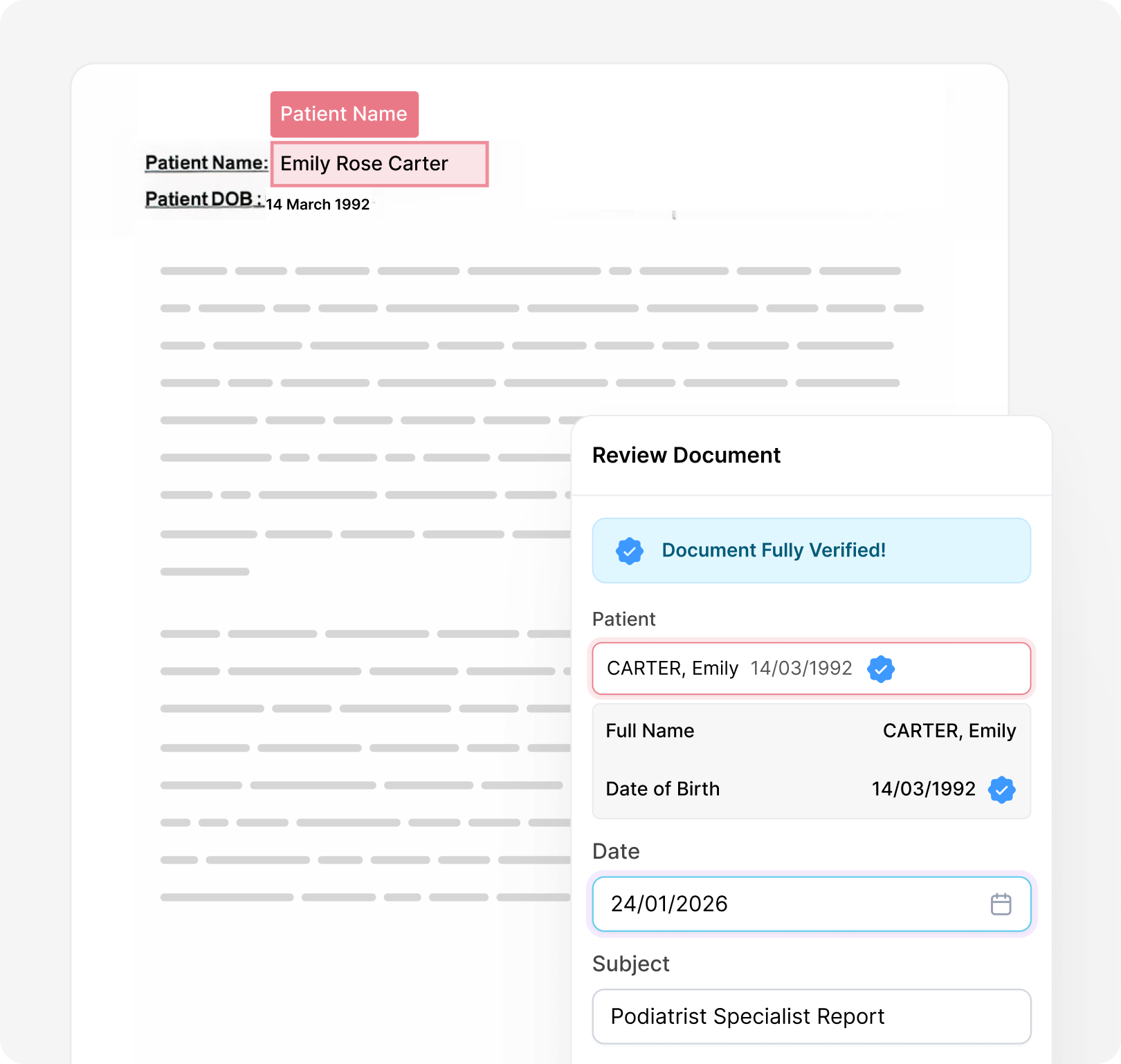 Samantha automatically uploads, verifies and allocates all incoming from email, fax and scanner to the correct patient file or Doctor’s Inbox